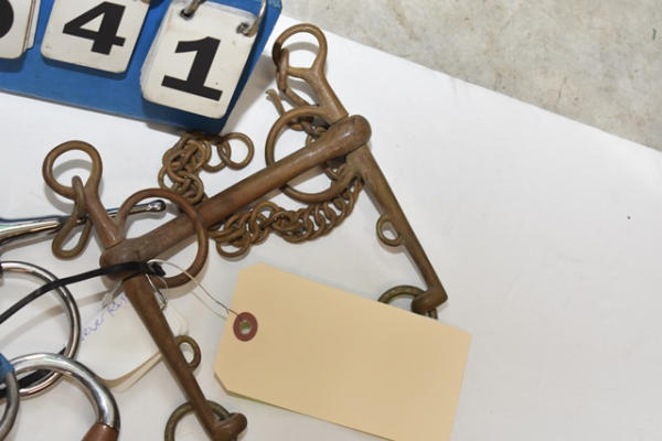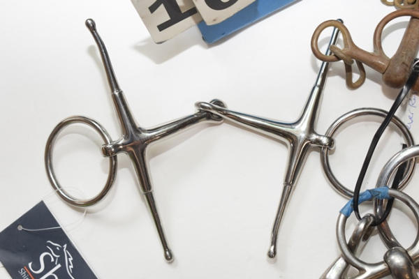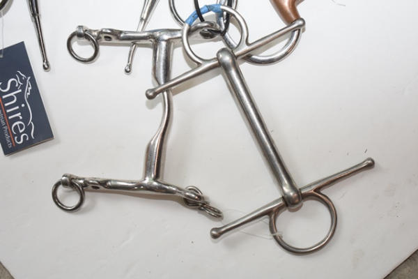 Lot of 5 5" bits including a copper Pelham, snaffle with a straight mouth (smooth on one side, rippled on the second side), fat mouth Pelham straight bar, copper roller and a New Shires foamer bit
