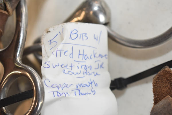 Lot of 5 bits including an aluminum engraved on the side shank grazing bit, French link dog bone loose ring snaffle, sweet iron mouth slider cow horse bit, a copper roller sweet iron mouth hackamore and a copper Tom Thumb