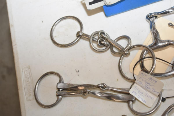 Lot of 5 5" bits including a new Shires foamer, double twist slow twist egg butt snaffle, straight mouth Pelham, slow twist snaffle and an English double ring driving bit with large O-ring for reins and small O-ring for check bit