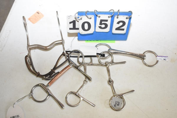 Lot of 5 3 3/4" pony/mini bits including a western grazing bit, a straight mouth copper driving bit, straight bar O-ring, and 2 spoon driving bits