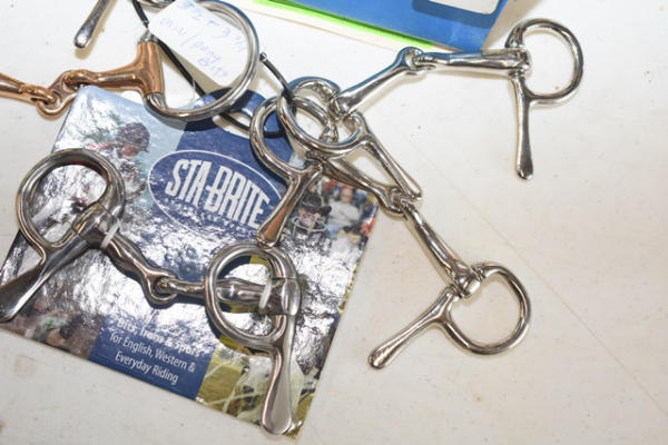 Lot of 5 3", 3 1/2", and 3 3/4" bits including a jointed mini driving bit, a French link copper mouth, 2 spoon driving bits, and a new Stay Bright spoon driving bit with fat mouth