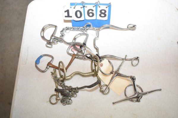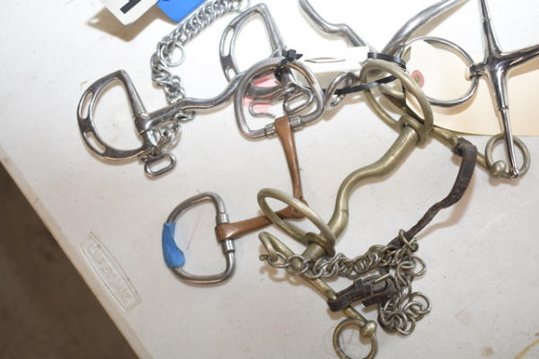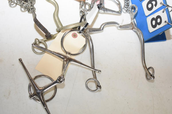 Lot of 5 4 3/4" bits including a foamer, a d-ring snaffle, a Kimberwick, a long shank square port Tellum/grazing bit, and a Made in England with inside rings that has a Pelham on the outside and a single floating loose ring to hook to the over check or your double bridle