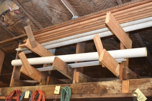 Mixed lot including 9 shutters, misc. wood pulls, PVC pipe, trim work, overhead racks, and shutters