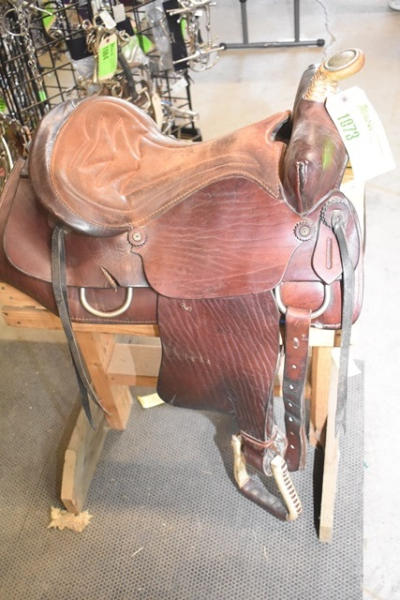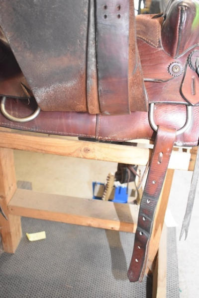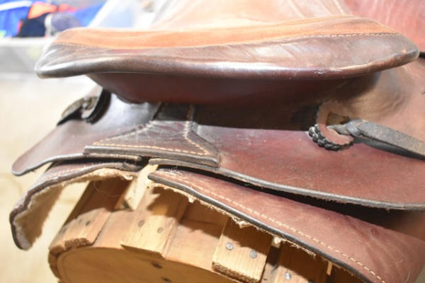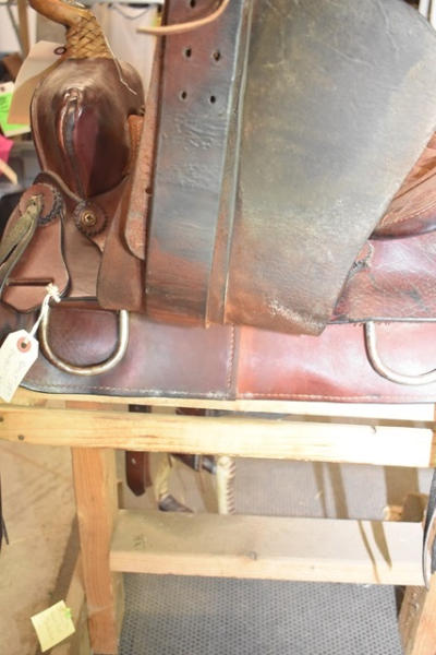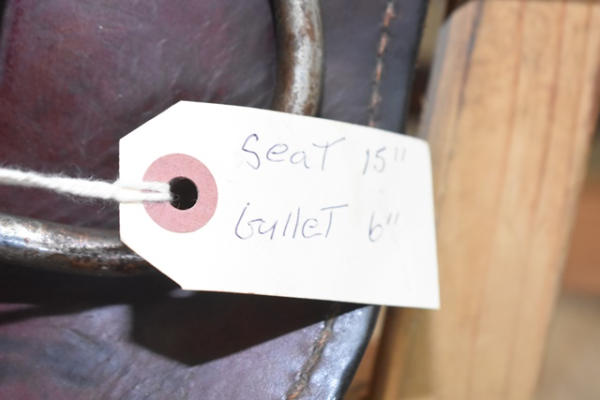 15" seat, 6" gullet, leather saddle with suede out seat and tie string buckle