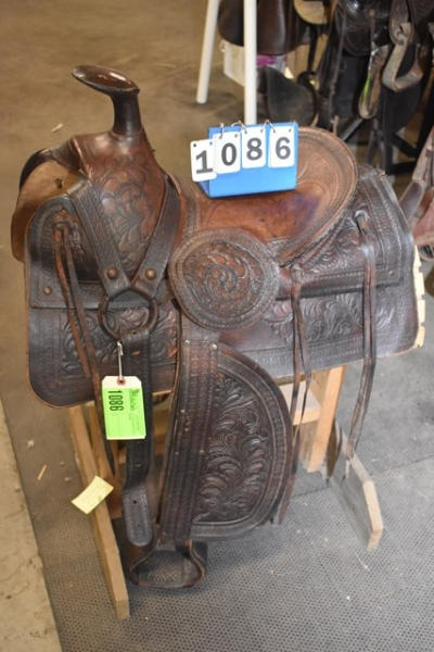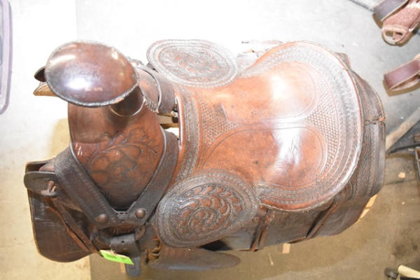 Saddle, Sam Stag rigging vintage square skirt with stripe underside, high fork, A fork, 14" seat, 5" gullet, outside fender straps, a unique piece