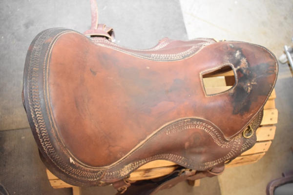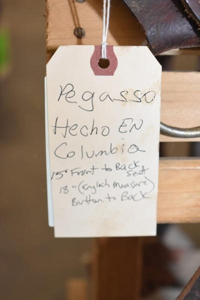 Pegasso, Hecho en Columbia, 13" front to back, seat 18" when measured English style (measured button to back), high back seat, trim saddle, no horn, open gullet area, with double rigging, matching fenders and leather stirrups