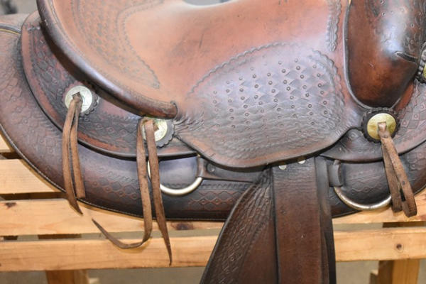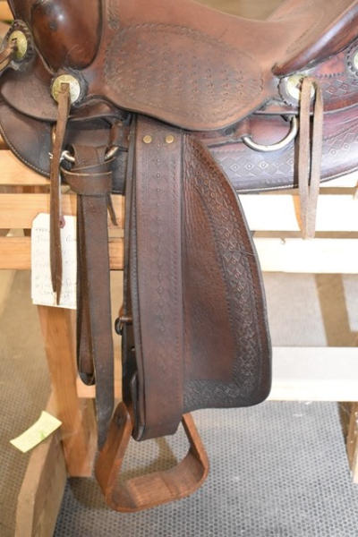 Famous Jumbo Brand saddle with 14" seat, 5" gullet, #568 stamped on it, outside fender straps and a wide swell, Sohoeukoff, Made in USA, with antique wooden stirrups