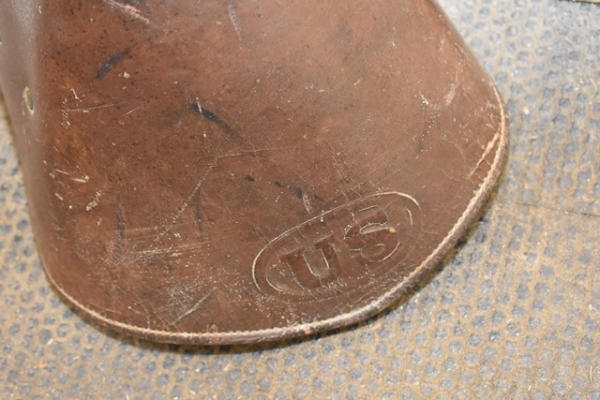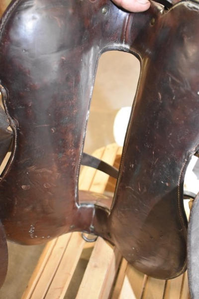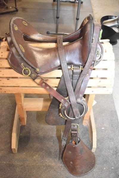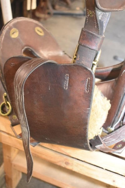 1918 Rock Island Arsenal Calvary Saddle, 11" seat with tapaderos, it is stamped "US" and it has girth and over straps included, brass fittings, curved high back seat, open gullet