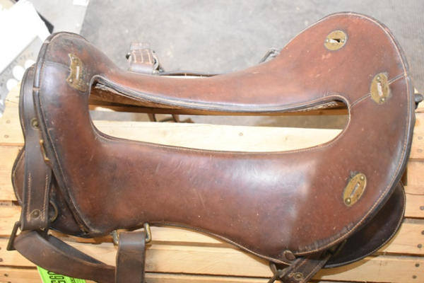 11 1/2" seat Calvary saddle, stamped "DFBCO", has girth strap and left side has "US" stamped on the tapaderos, open gullet, high back, used mostly for military