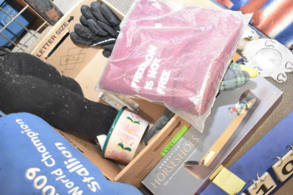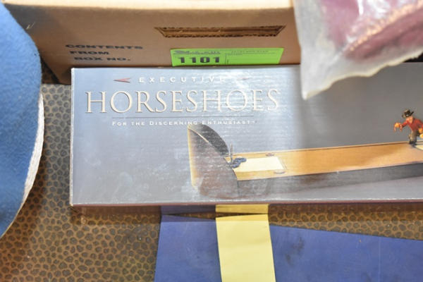 Box lot with Executive Horseshoe Game, winter glove and hat set, black door draft, Friesian tote bag, flower planter, duck door draft, 2 throw rugs (1 with horses), and a fold out rattan mat