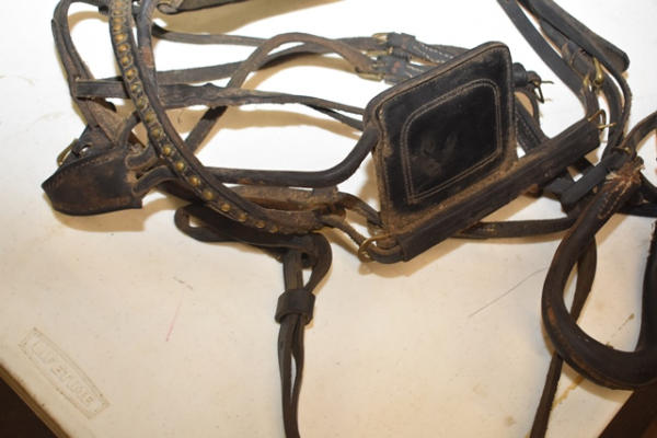 Pony spotted back pad with crupper, pony bridle, does not have traces or lines, but it makes a good lunging harness, has brass fittings