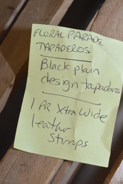 Tote with floral parade tapaderos, black plain design tapaderos, 1 pair of extra wide leather stirrups