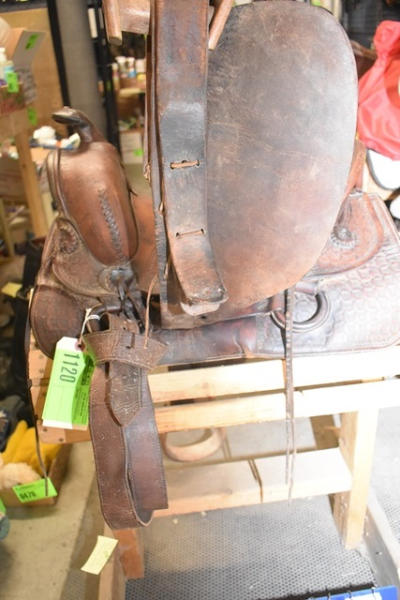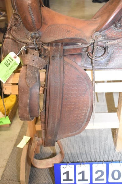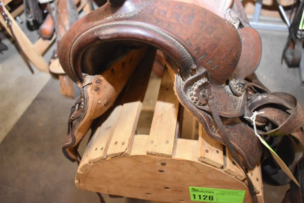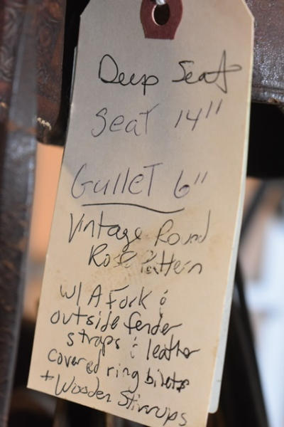 Deep seat 14" saddle seat, 6" gullet, vintage, round, rose pattern with a A fork and outside fenders, straps and leathers with covered ring billets and wooden stirrups, double rigged with the outside stirrup leathers, antique wood stirrups