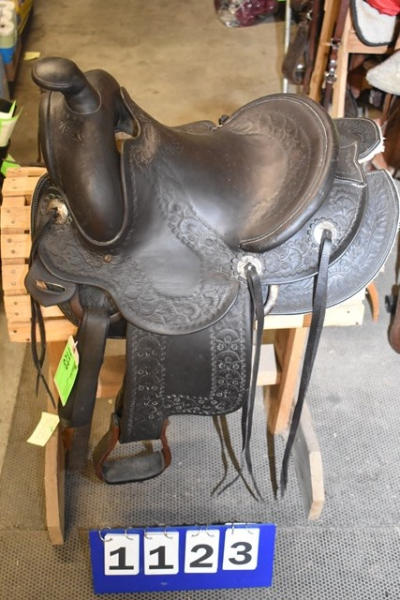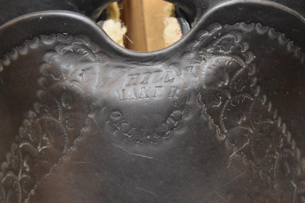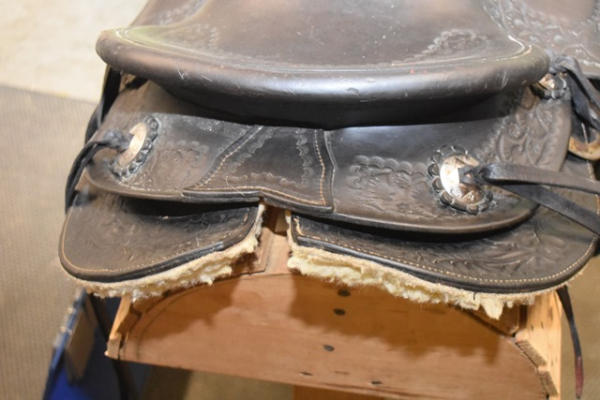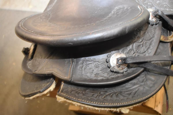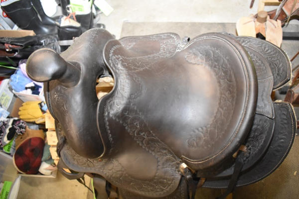 Hillmaker nice heavy weighted, vintage saddle, 14" seat, 5" gullet, metal lined mahogany stirrups with Blevin buckles and double rigged with a round skirt