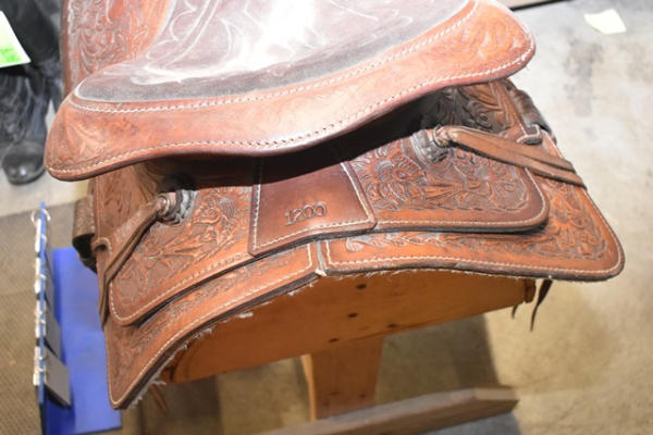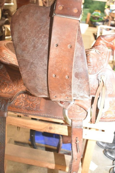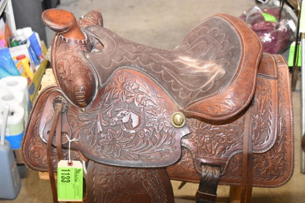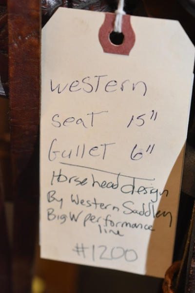 Western seat saddle, 15" seat, 6" gullet, has horsehead design stamped into the fenders, saddle is by Western Saddlery with Big W Performance Line #1200, has Blevin buckles and matching stirrups