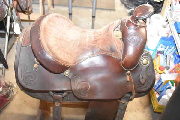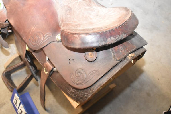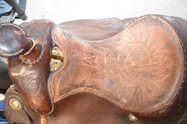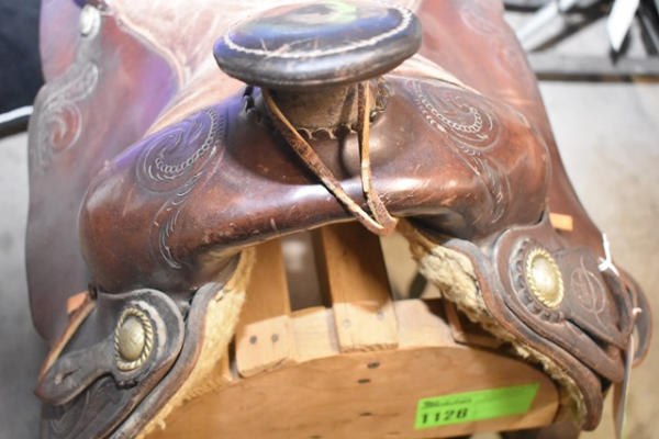Longhorn roping saddle, #773, 16" seat, 7" gullet, has scallops type minimal trim, big strong saddle horn and a suede out padded seat with leather covered Blevin buckles