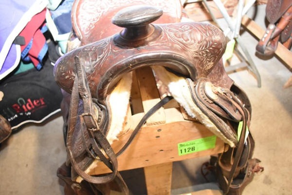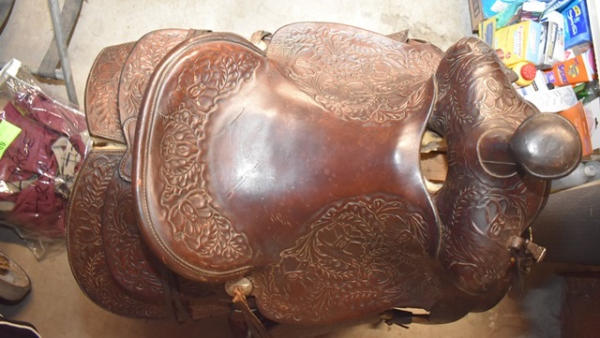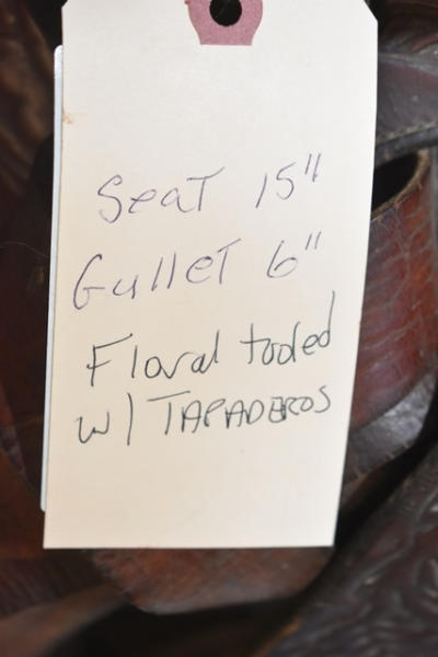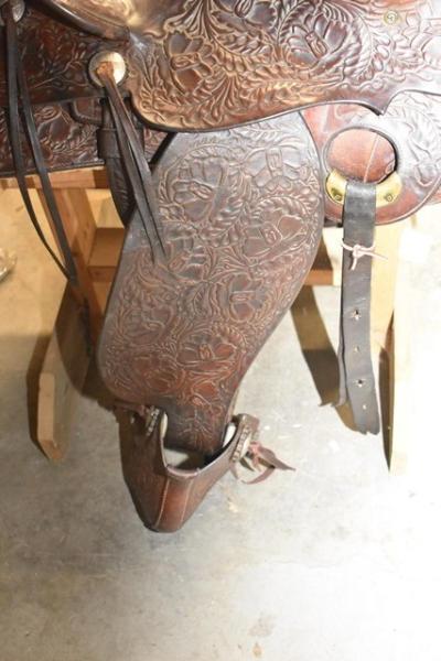 Floral tooled saddle with old tapaderos, heavy duty, vintage older saddle, probably from the 1940s or 1950s, has floral scallop trim and good fleece