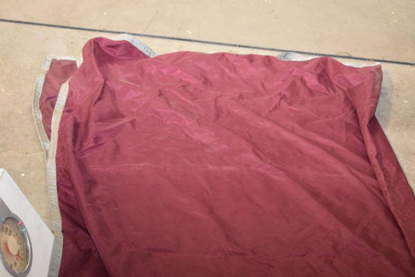 Large horse, head to tail rain sheet in maroon with gray trim