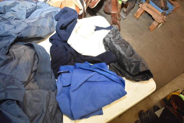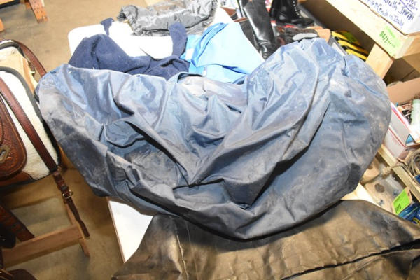 Lot includes a large Dura-Tech tack bag, South Texas Pinto 5 point champion, a saddle towel and driving apron and trailer or corner hay feeder, etc.