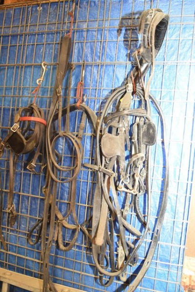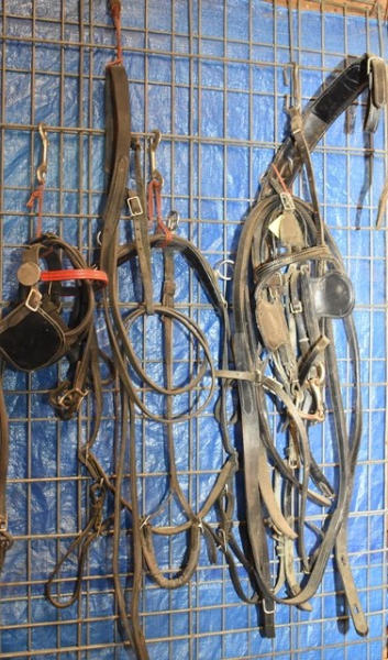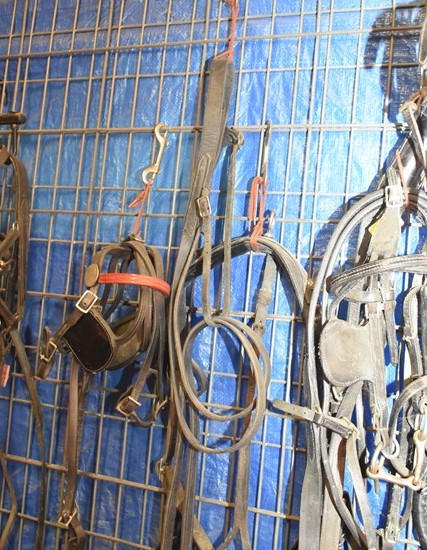 Tack lot including miniature horse size spare parts including britching, lead chains, tie backs, set of traces, belly band, a couple different bridles (1 with red brow band, 1 with round D-ring shape), 2 small back pads