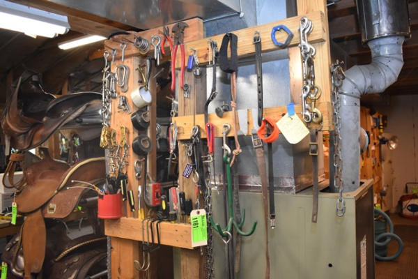 Lot including double ended snaps, quick links, brass double snaps, a few screwdrivers, some tack hooks, some misc. chains, tape, electrical tape, hoof picks, pliers, some tie back straps, some screw eyes, fence pliers, etc.