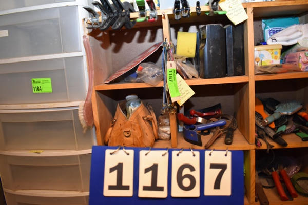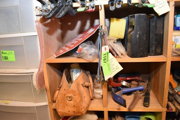 Contents of 4 cubbies including tail braiding kits, signage for fly spray, sponge and bungees, optical toys, shedding blade, saddle soap, tooled leather bag with Honey Harness and little mini bungee straps