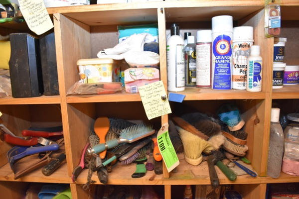 Contents of 4 cubbies including baby wipes, towel and blanket clip, twitch, Peppy Grand Champion Coat Spray, Cowboy Magic Detangler, a collection of hair brushes, collection of body brushes including mud and soft brushes and hook picks