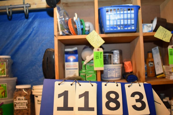 Contents of 4 cubbies including 3 new Likits, 3 feed scoops, extra Likit spools, 4 tubs of Bag Balm, Epson Salts, leg straps, 9 boxes of various size needles, Duramax ice boot, spray bottle, Ichthammol, vet wrap, and sam splints