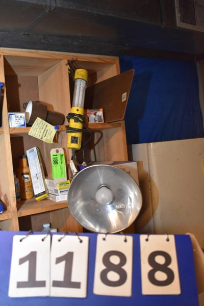 50mm farrier nails, brown clip on light, yellow work light that can be hung, aluminum clip on light (large), Super Fast Hoof Repair, new 18 rolls of Coflex, Absorbine, and paste wormer (not expired)
