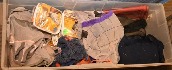Tote full of supplies including 8 Cashel fly masks with ears and long nose (a few are new in the package), 6 knit ear fly bonnets, 1 cooler, 2 driving back pads, 3 mesh fly masks with no ears, 4 mesh fly masks with ears, and 2 roadster diapers