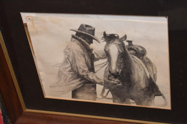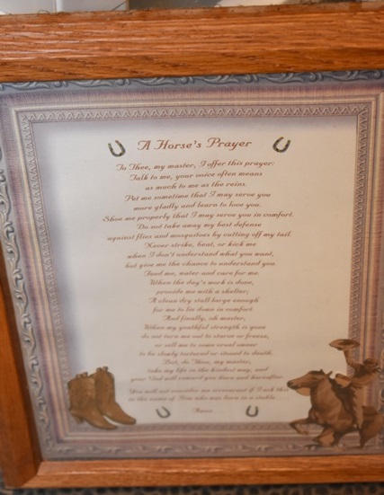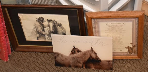Lot of 3 photos including 1 with a cowboy feeding a horse an apple (13" x 15"), The Horsemanship Prayer (12" x 10"), an acrylic with Love Each Other (12" x 8)