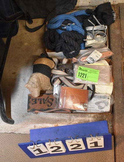 Misc. collection including 2 tote bags, fence hangers, heavy lead ropes, lunge line, Bell boots, western hat covers (all new), new rain poncho covers, for sale sign carved out of wood to hang on stall door and a string horse nail art.