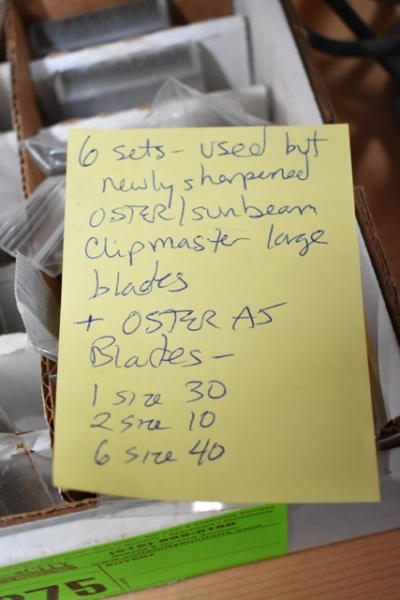 Lot of 6 sets used, but newly sharpened Oster/Sunbeam/Clipmaster large blades and Oster A5 blades, 1 size 30, 2 size 10, 6 size 40