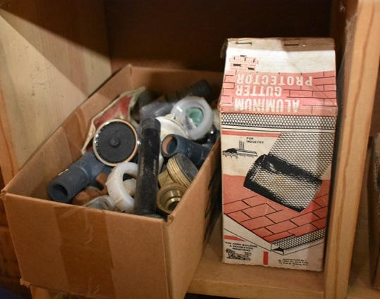 Contents of 4 cubbies including sheeting clips, assorted peg hook hardware, assorted hand tools, assorted pipe, etc.