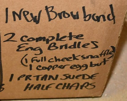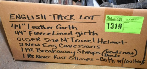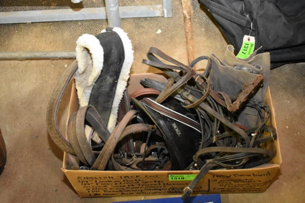 English tack lot including 44" leather girth, 44" leather fleece lined girth, older size medium Troxel helmets, 2 English cavessons, 1 PR break away step up, 1 PR Never Rust stirrup, assorted brow bands, bridles, egg butts and half chaps