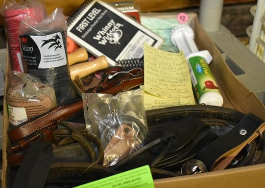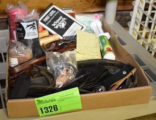 #1326 – Lot includes 4 rolls of vet wrap, small ear plugs, Slick and Easy Shedder, Apple Electrolytes, Pelham chain, 5 Winnie Widgits, Dressage tests, English billet protector, 2 leather breakaway straps, boot pulls, new black slobber straps, new rubbers and leather for breakaway stirrups, blanket pin and scissor snap, bag of Chicago screws, saddle stirrup garters, Bell fob keychain, 2 English grab straps (new), elastic garter for Jodhpurs