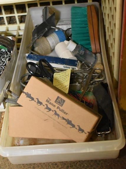 Copper tack training bands, rubber bit guards, check straps, check bit attachments, strap with conchos and 9 curb chains, mane pullers, surgical stainless steel scissors and clamps, 2 pill crushers, brush, hand sanitizer, misc. snaps, etc.