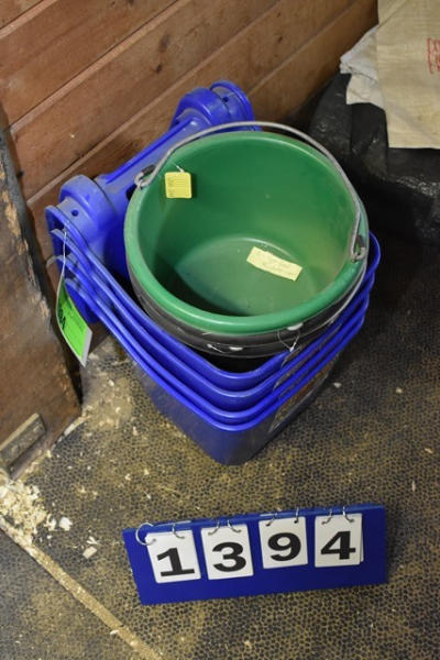 Lot of 3 5-quart feed buckets (new), 4 new over the fence feed holders (12 quart)