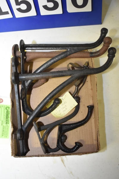 Lot of 3 10" large cast iron hooks, 1 5" hook, 1 4" hook and 1 old cow bell