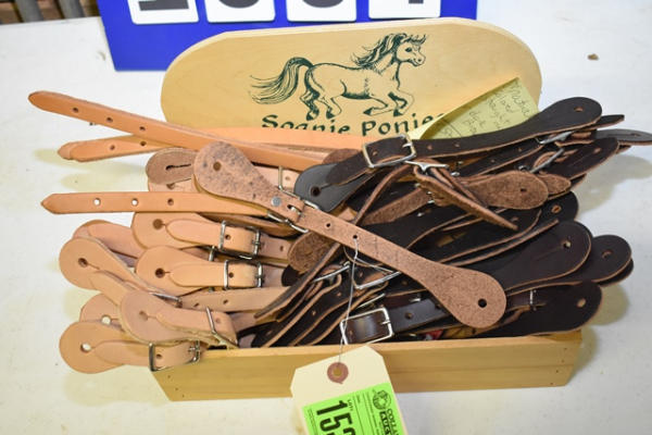 Lot of spur straps in a wooden Soapie Ponies box including 8 piece natural color, 2 piece straight natural, 9 pair dark brown.