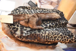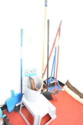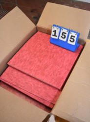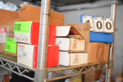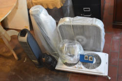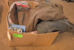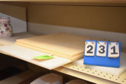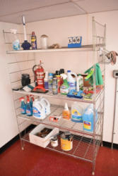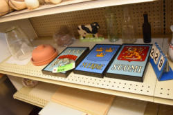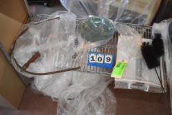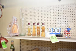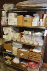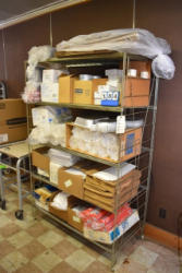 Shelving unit contents consisting of utensils, cotton roll, clip boards, Cappiello shirts