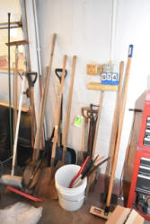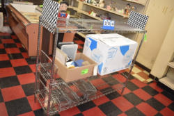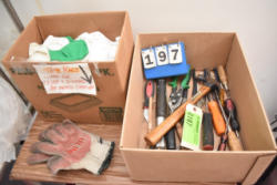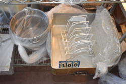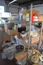 #263 - Shelving unit contents consisting of utensils, cotton roll, clip boards, Cappiello shirts