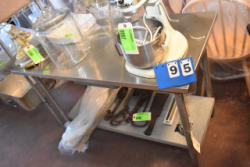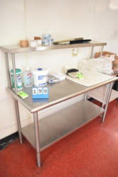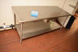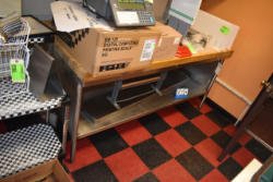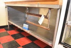 Butcher block top, stainless steel table, approx. 72" long x 33 1/2" deep
