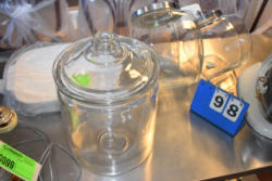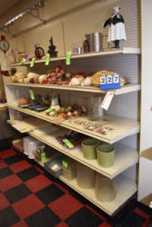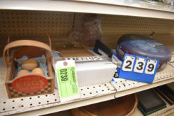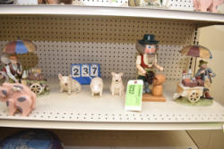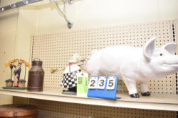 Shelving unit contents consisting of scoopers, cookie jar, country ham pig, wicker basket, etc.