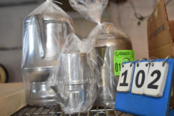 Lot of strainer bucker, can opener, stainless steel pitchers