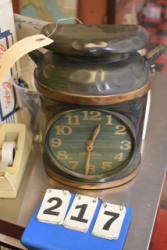Shelf lot of décor items including picture frames, wooden basket, time clock