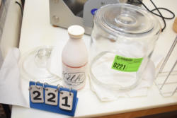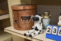 Shelf contents consisting of milk bottles, milk glasses and ceramic cow