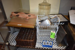#265 - Shelving unit contents consisting of scoopers, cookie jar, country ham pig, wicker basket, etc.