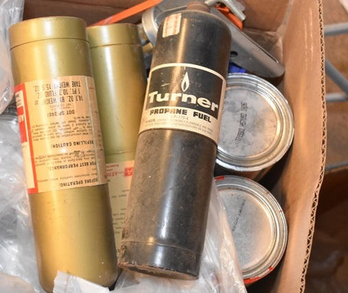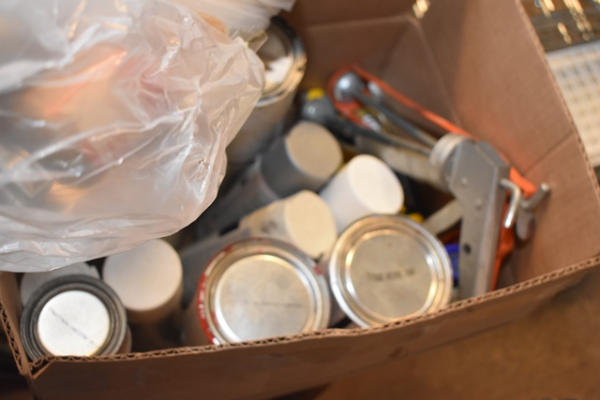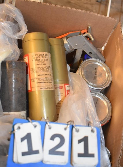 Box lot of paints, caulk guns, etc.