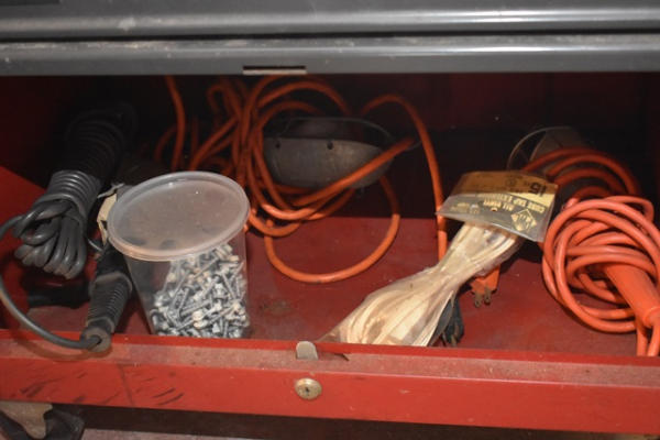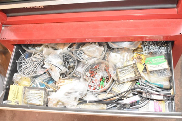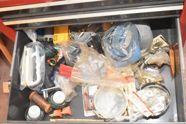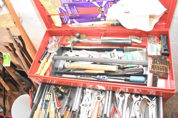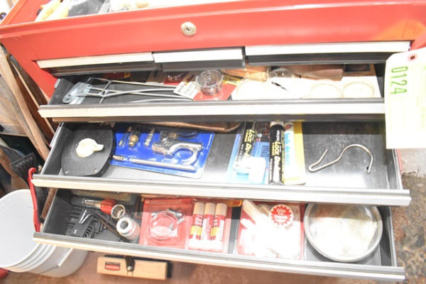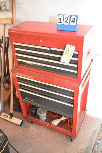 Craftsman toolbox, approx. 46 1/2" tall x 26 1/2" wide, with contents consisting of pipe wrenches, tape measure, glue sticks, screws, etc.
